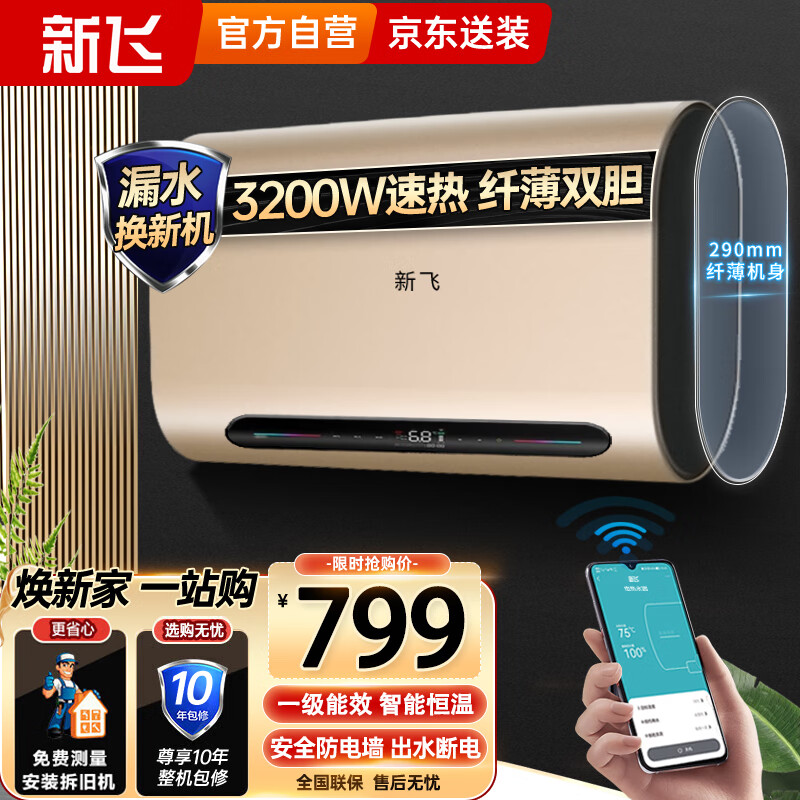 新飞电热水器家用储水式手机遥控预约60升一级能效3200W节能速热出水断电卫生间淋浴DSZF-B301-60L耀金价格:799.00元!