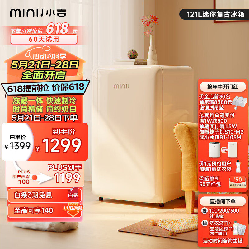 小吉(MINIJ)【保价618】121升单门冰箱小冰箱 租房小型家用冰箱BC-121CM迷你复古冷藏冷冻一体电冰箱礼物价格:1399.00元!