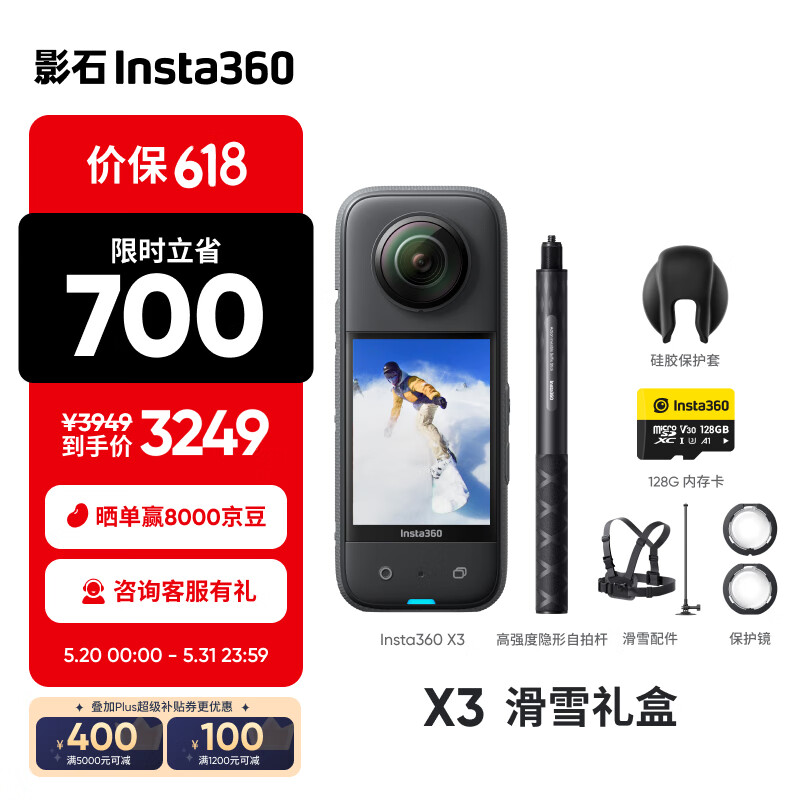 Insta360影石 X3全景运动相机防抖相机5.7K高清360全景摄像机摩托车vlog滑雪(新版滑雪套装)价格:3249.00元!