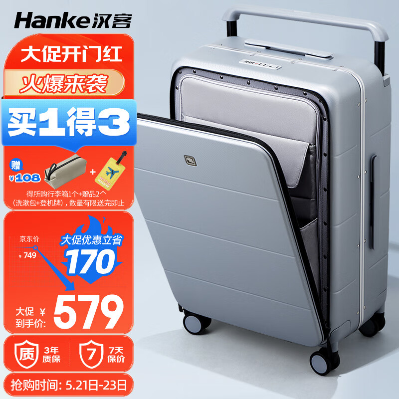 汉客宽拉杆行李箱铝框男前开盖拉杆箱旅行箱大容量24英寸环保灰密码箱价格:749.00元!
