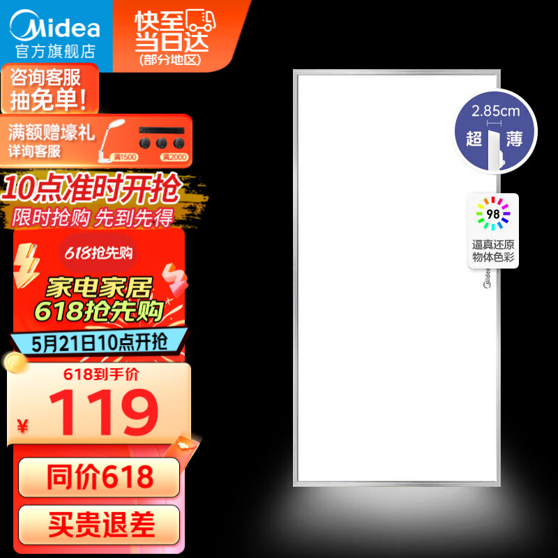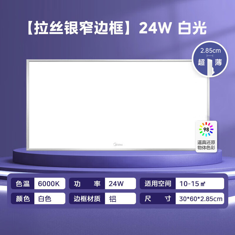 美的(Midea)LED集成吊顶灯面板灯护眼高显指厨房灯窄边银色边框厨卫灯24瓦价格:119.00元!