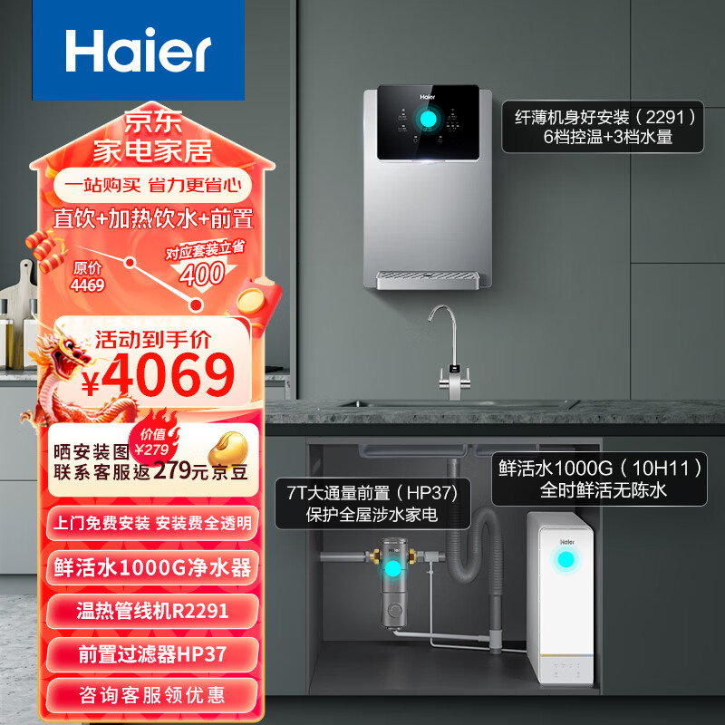 海尔(Haier)玉净鲜活水净水器家用净水机1000G厨下式直饮净水器+前置过滤器+管线机HRO10H11+HP37+HGR2291价格:4069.00元!