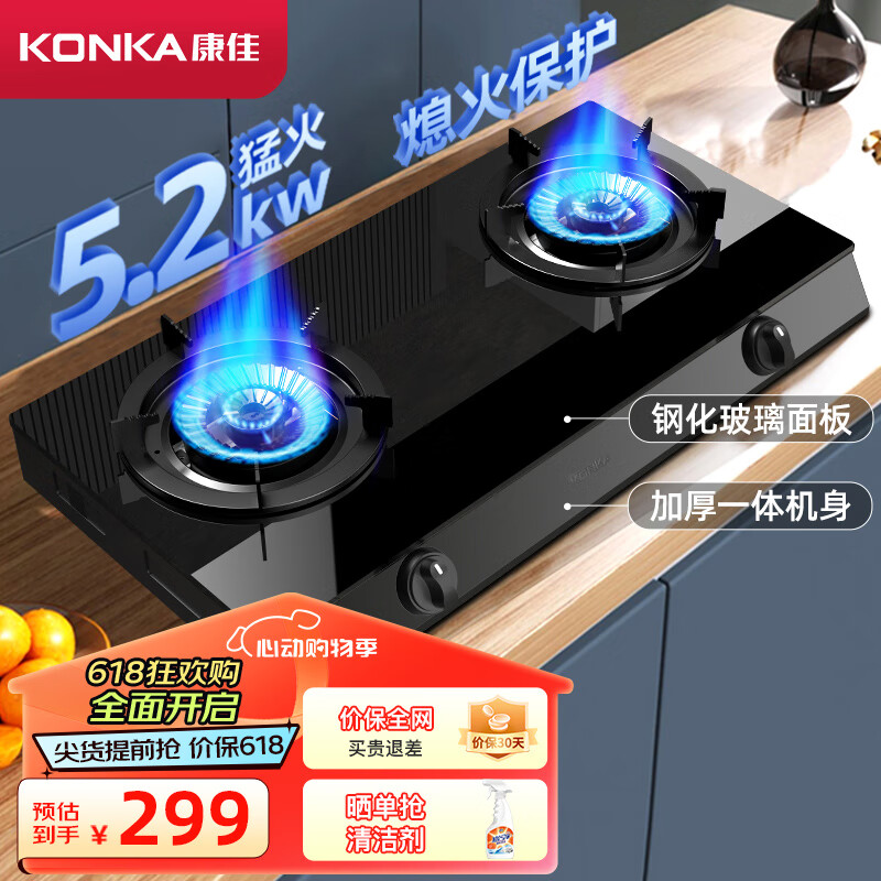 康佳(KONKA)灶具燃气灶双灶台灶 5.2kW猛火家用台式 天然气煤气灶 黑色玻璃面板炉具 JZT-T526Y(天然气)价格:298.42元!