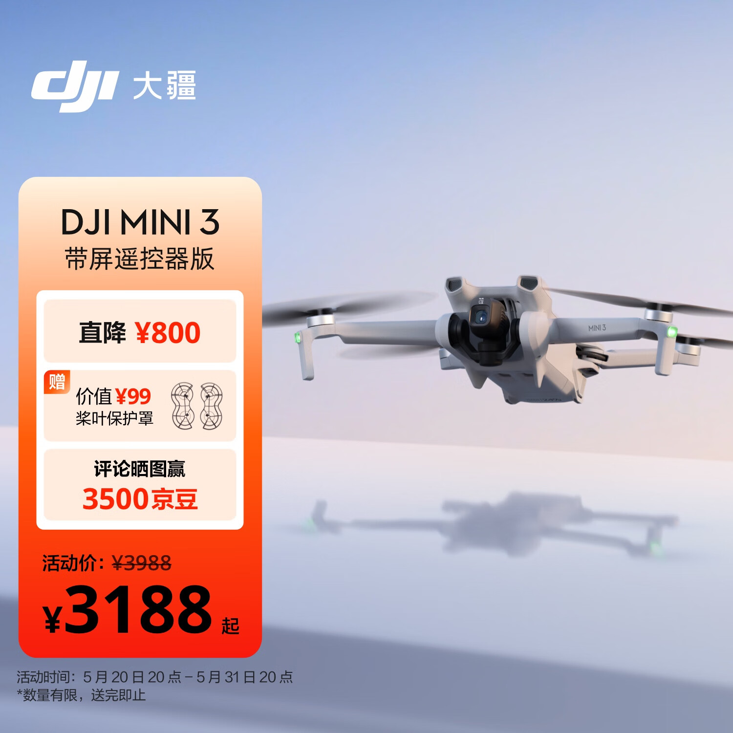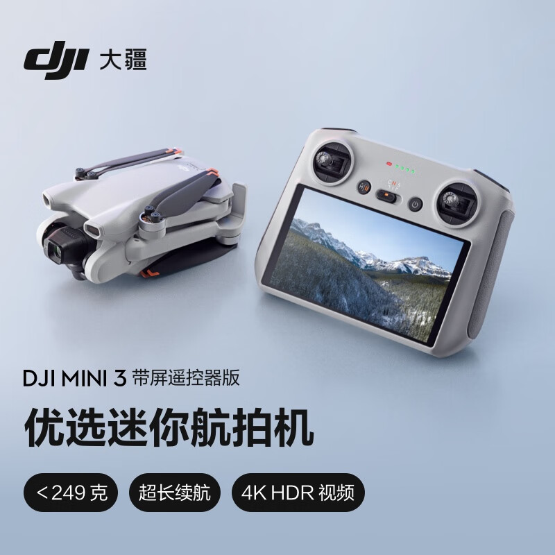 大疆 DJI Mini 3 带屏遥控器版 优选迷你航拍机 智能高清拍摄无人机 小型遥控飞机+随心换2年版实体卡价格:3716.00元!