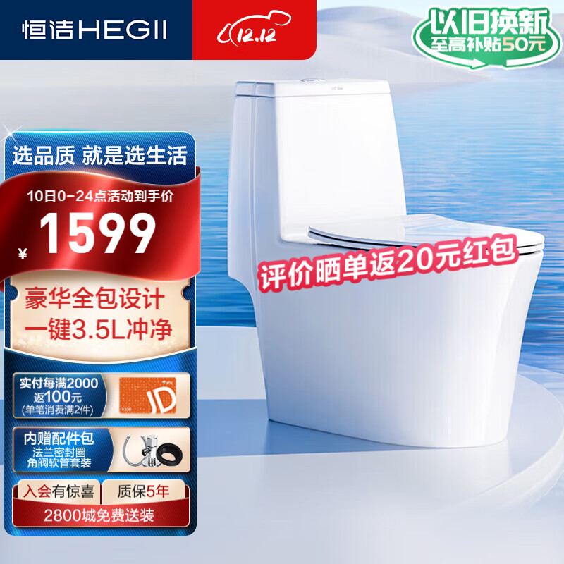 恒洁(HEGII)马桶143 超旋风大冲力一键速冲除污连体坐便器HC0143DT-305价格:1799.00元!