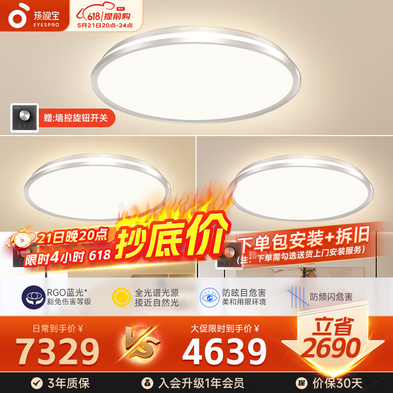孩视宝【两室一厅套装】全光谱护眼吸顶灯卧室书房客厅灯儿童房灯AH37*3价格:7329.00元!