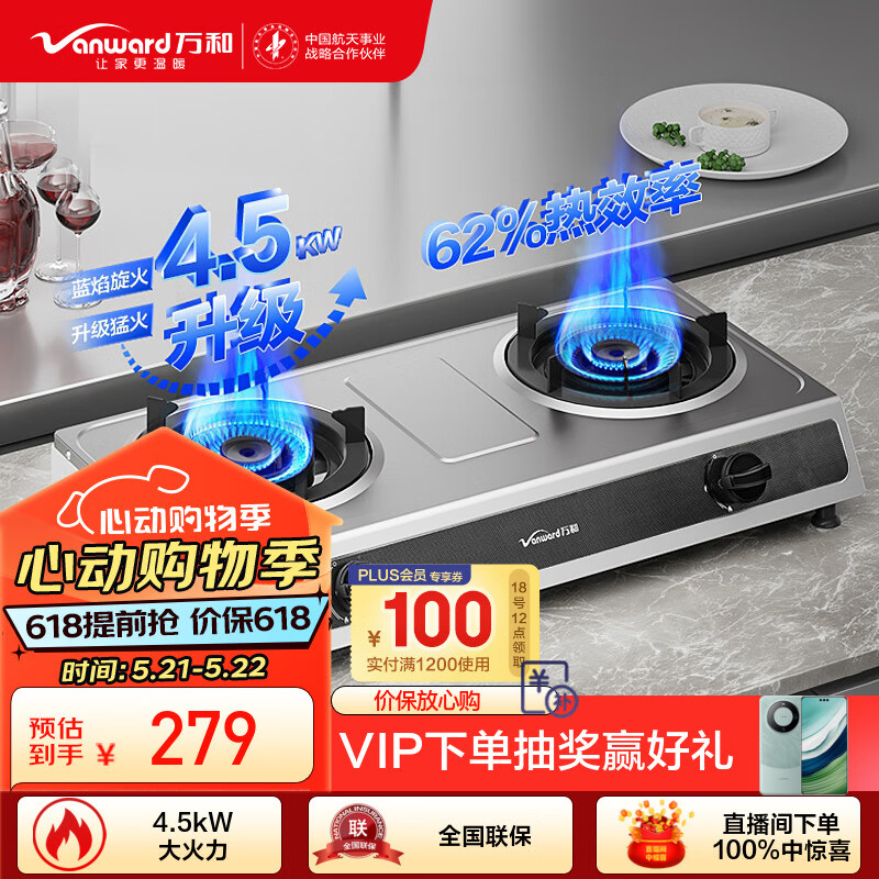 万和(Vanward)燃气灶具 不锈钢家用台式燃气灶 62%热效率天然气灶具 4.5KW大火力 JZT-D9B28(天然气)价格:279.00元!