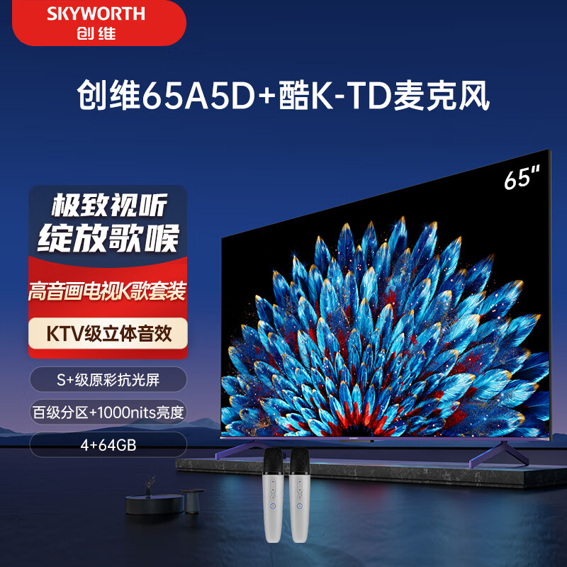 创维电视65A5D+K-TD麦克风套装 65英寸电视机 百级分区 护眼游戏电视 家庭K歌影院 双支麦克风价格:4748.00元!