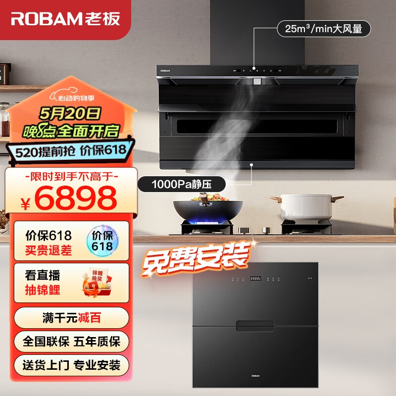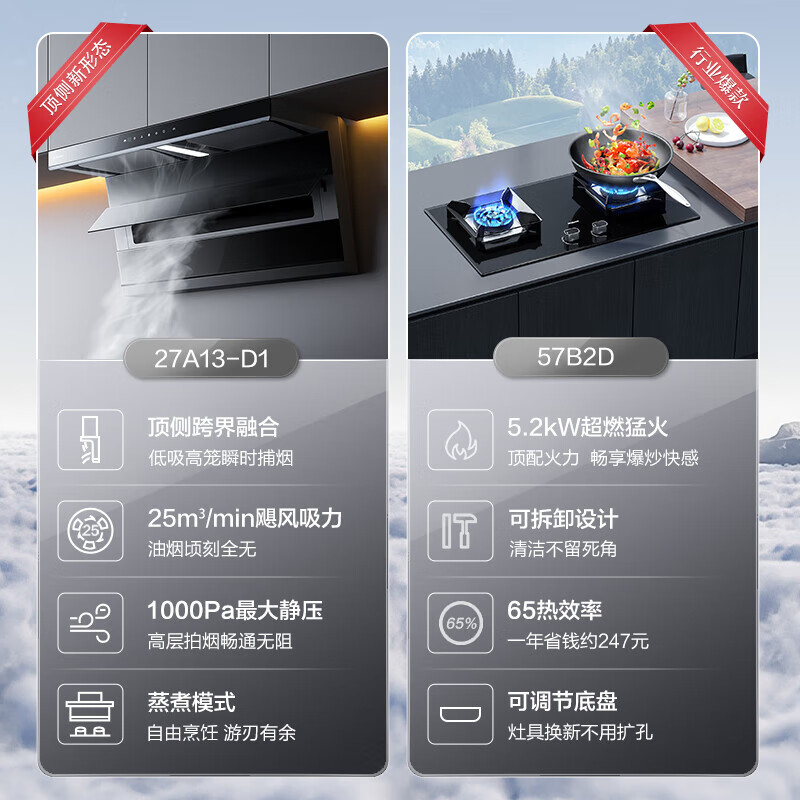 老板油烟机家用小黑翼顶侧双吸抽油烟机七字型排油烟机大吸力25风量侧顶吸烟灶消三件D1+57B2D+XB710A价格:7198.00元!