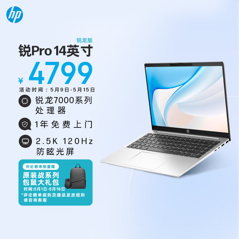 惠普(HP)锐Pro 14英寸轻薄笔记本电脑(标压锐龙八核R7-7840H 16G 1T 2.5K 120Hz高色域 长续航 AI 高性能)价格:4599.00元!