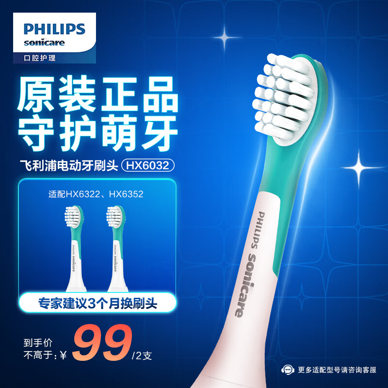 飞利浦电动牙刷头 儿童迷你型 2支装 HX6032/35 适配HX6322 HX6352(新包装6032/63随机发货)价格:99.00元!