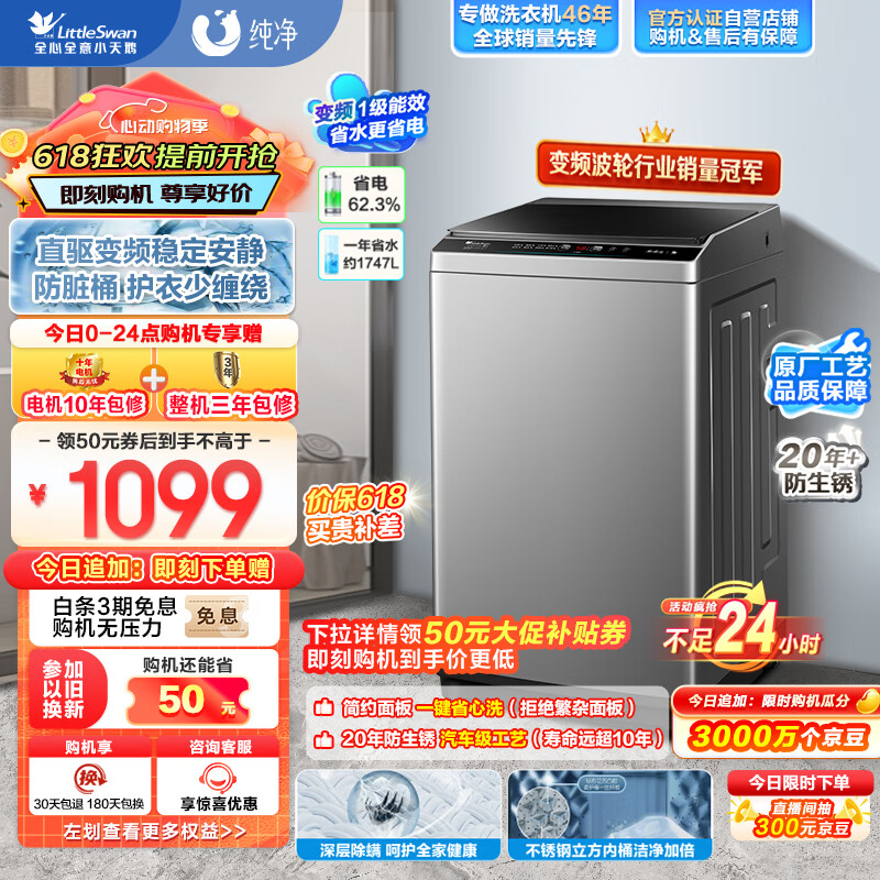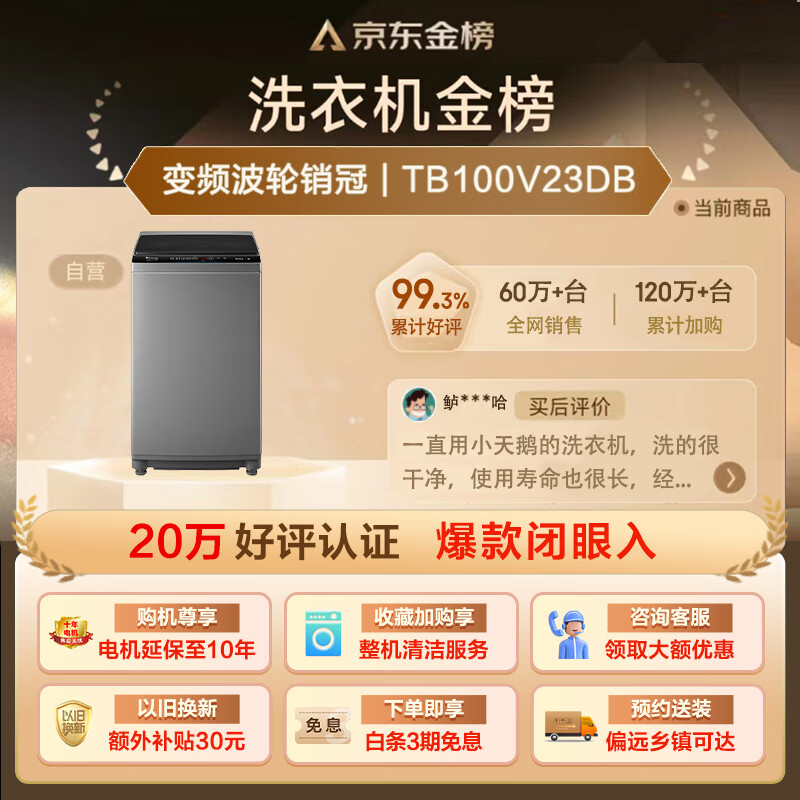 小天鹅(LittleSwan)波轮洗衣机全自动 直驱变频 10公斤大容量 免清洗不脏桶 升级除螨 以旧换新 TB100V23DB价格:1147.00元!