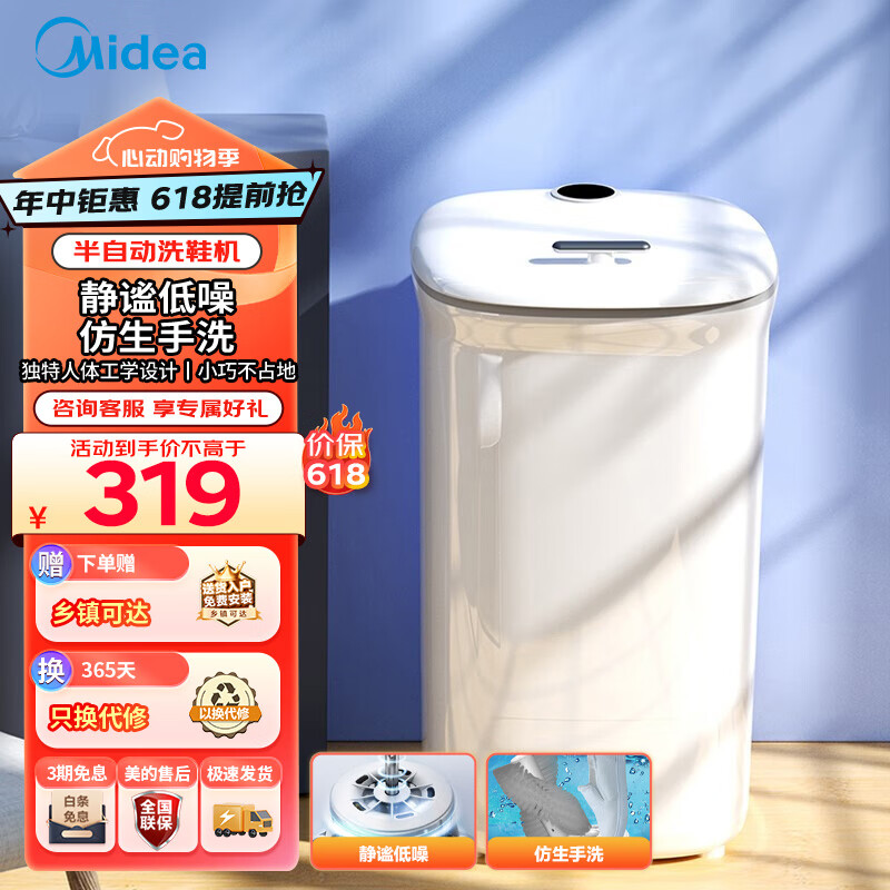 美的(Midea)4公斤家用半自动洗鞋机 迷你仿生手洗刷鞋机 懒人必备360°立体尼龙毛刷宿舍擦鞋神器MX-XXGW02价格:319.00元!