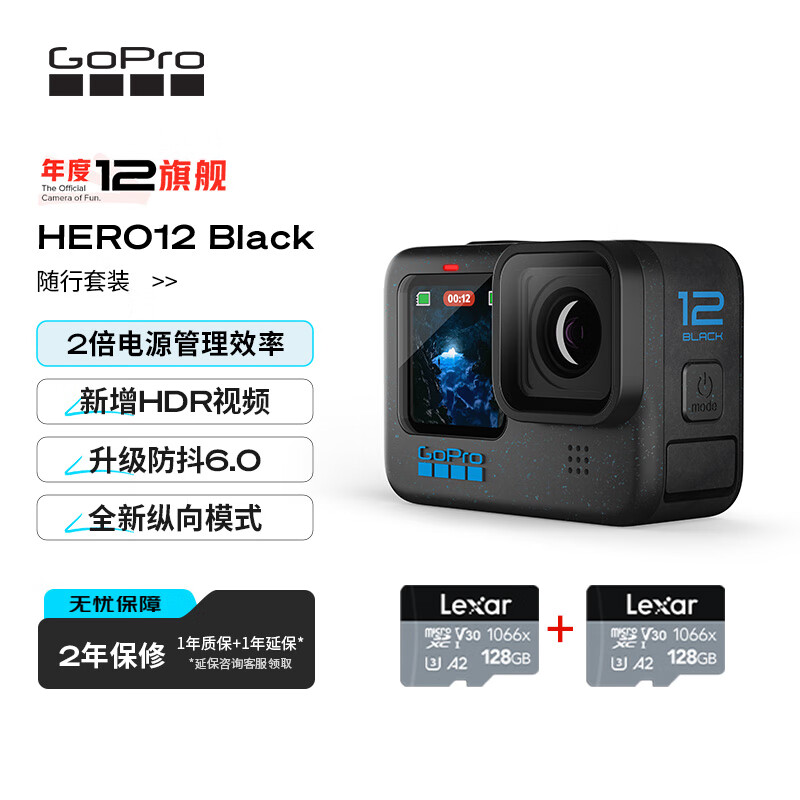 GoProH12运动相机 户外摩托骑行 潜水防水防抖相机 Vlog数码运动摄像机 随行套装加128G存储卡套组价格:3023.00元!