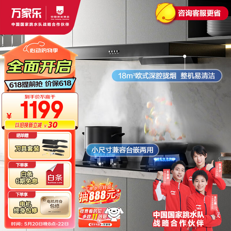 万家乐 抽油烟机 烟灶套装 18m3/min大吸力油烟机 欧式家用顶吸油烟机燃气灶具套装AT031+KA031B天然气价格:1399.00元!
