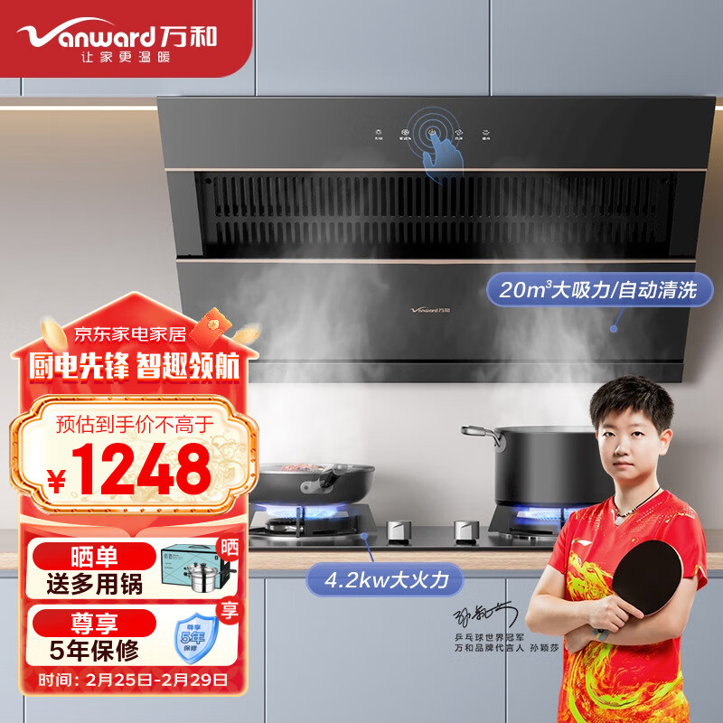 万和(Vanward)侧吸式抽油烟机 燃气灶套餐 20m3/min大吸力 一键自清洗 烟灶套装 钢化玻璃 J525S+B3L20(天然气)价格:1248.00元!