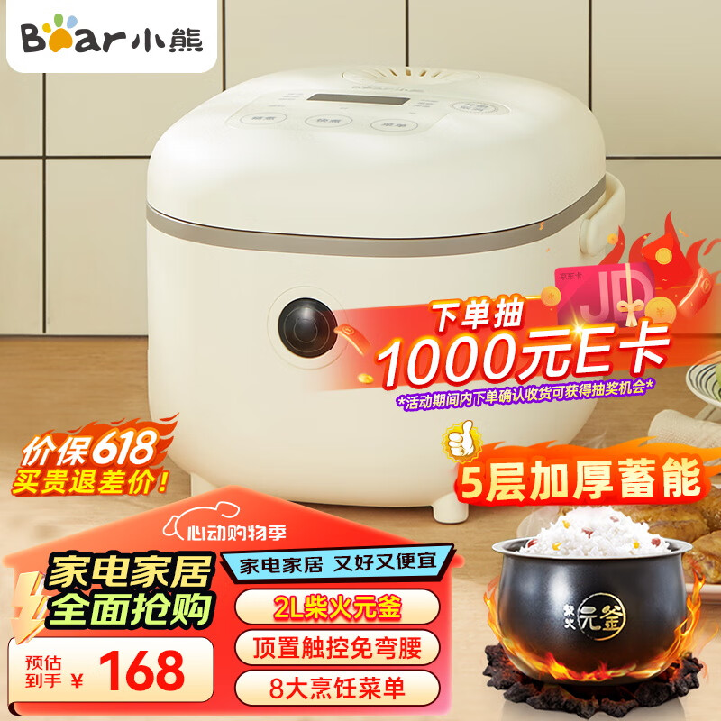 小熊(Bear)电饭煲小 2升迷你小容量智能预约小米粥保温1-2人小型多功能柴火元釜内胆2-3人电饭锅2L DFB-B20A1价格:168.00元!