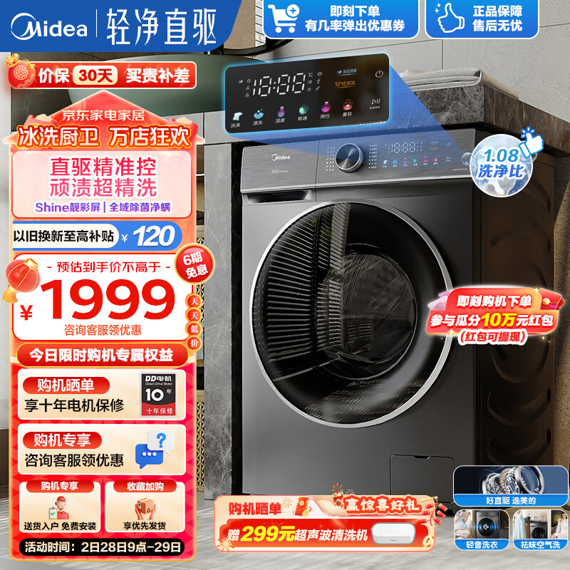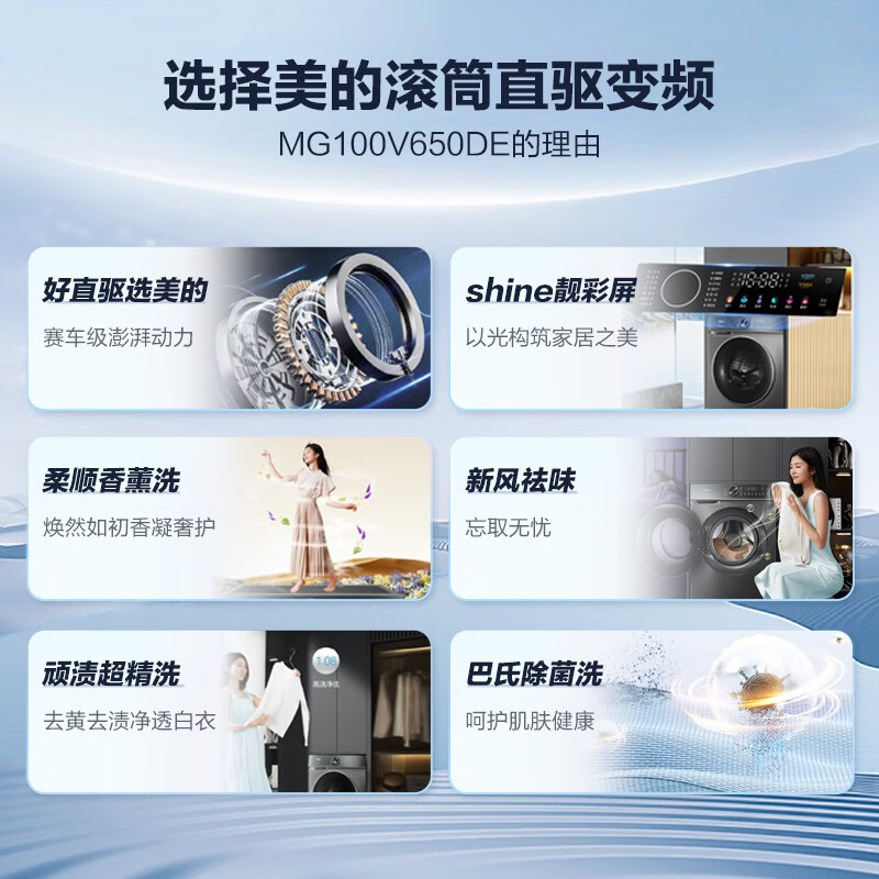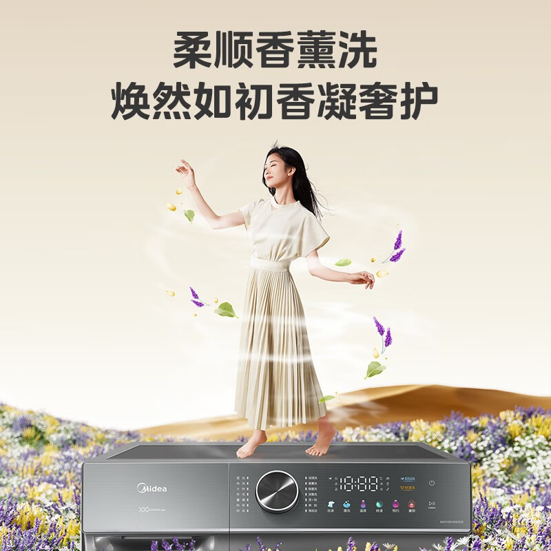 美的(Midea)滚筒洗衣机全自动 10公斤kg家用大容量 轻净直驱 新风祛味 柔顺香薰洗 【直驱彩屏升级款】 单洗滚筒MG100V650DE价格:1999.00元!
