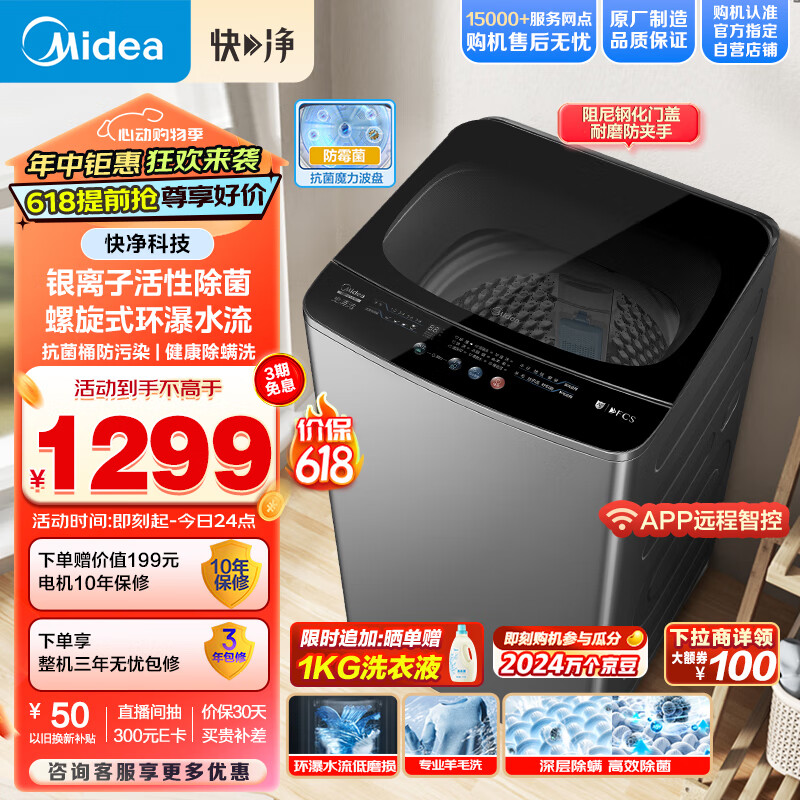 美的(Midea)波轮洗衣机全自动 快净系列 10公斤 环瀑水流低磨损 健康除螨 远程智控 专利免清洗 MB100V51Y价格:1299.00元!