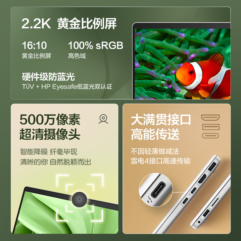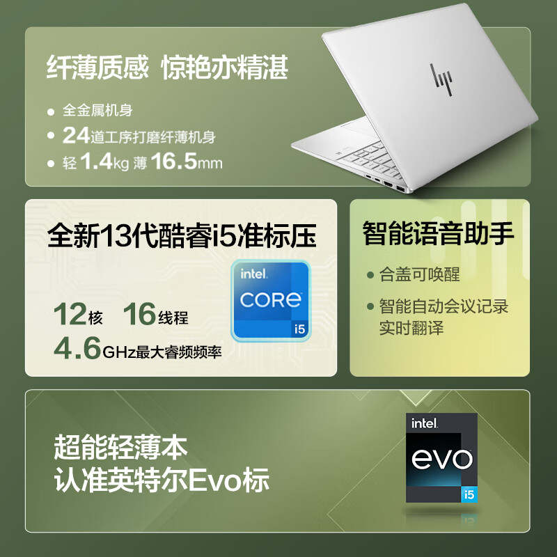 4、看了不少轻薄本,还是觉得惠普星系列比较合适,搭载英特尔13代酷睿cpu,16G内存,1T硬盘,还有EVO认证,妥妥的办公利器。做工很好,系统很流畅,关键颜值很高,点赞