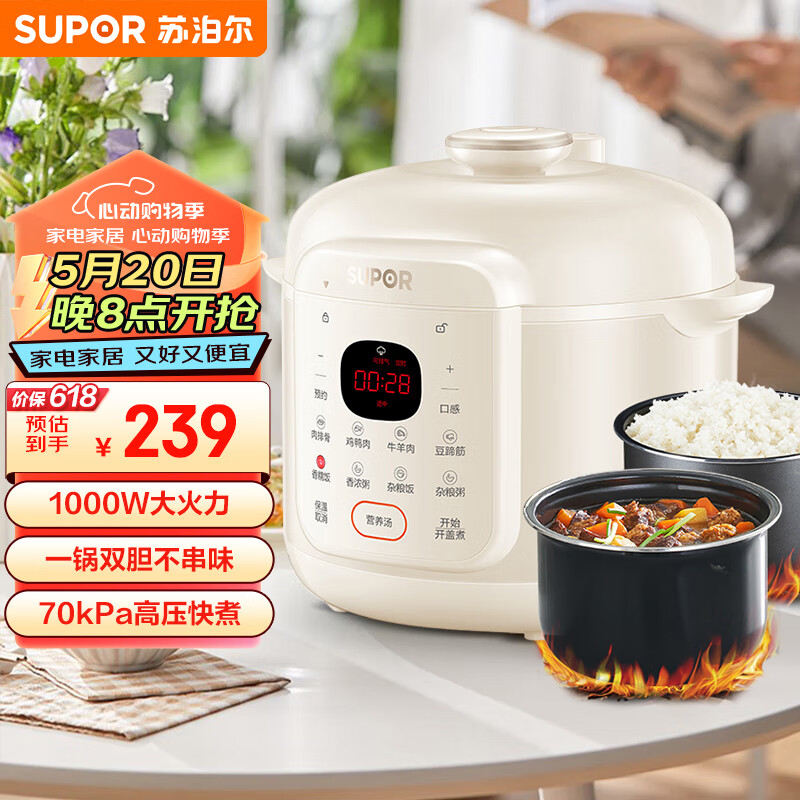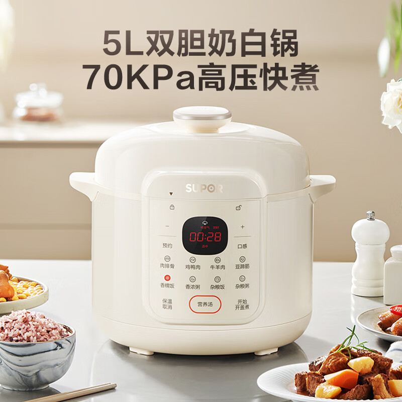 苏泊尔电锅5L家用高级奶白全自动家用智能预约多功能面板煲汤煮饭双胆SY-50YC5007电饭煲高压锅3-6人价格:239.00元!