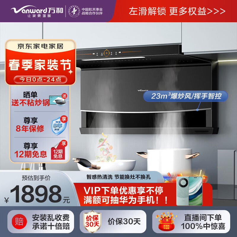 万和(Vanward)顶侧双吸7字型烟灶套装家用 23m3/min大吸力 智感热清洗 挥手控制 WL856+C5L90S(天然气)价格:1998.00元!