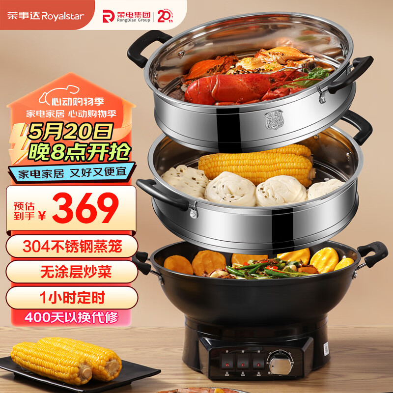荣事达 电蒸锅电炒锅多功能电热锅多用电火锅山东锅电煮锅双层 大容量电锅DRG-T38X价格:365.00元!