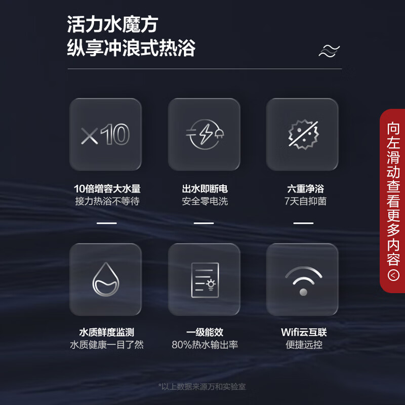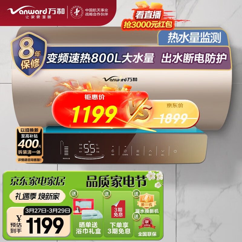 万和80升电热水器速热出水断电3000W一级能效10倍增容镁棒免更换水量水质监测E80-Q8D1-30价格:1199.00元!