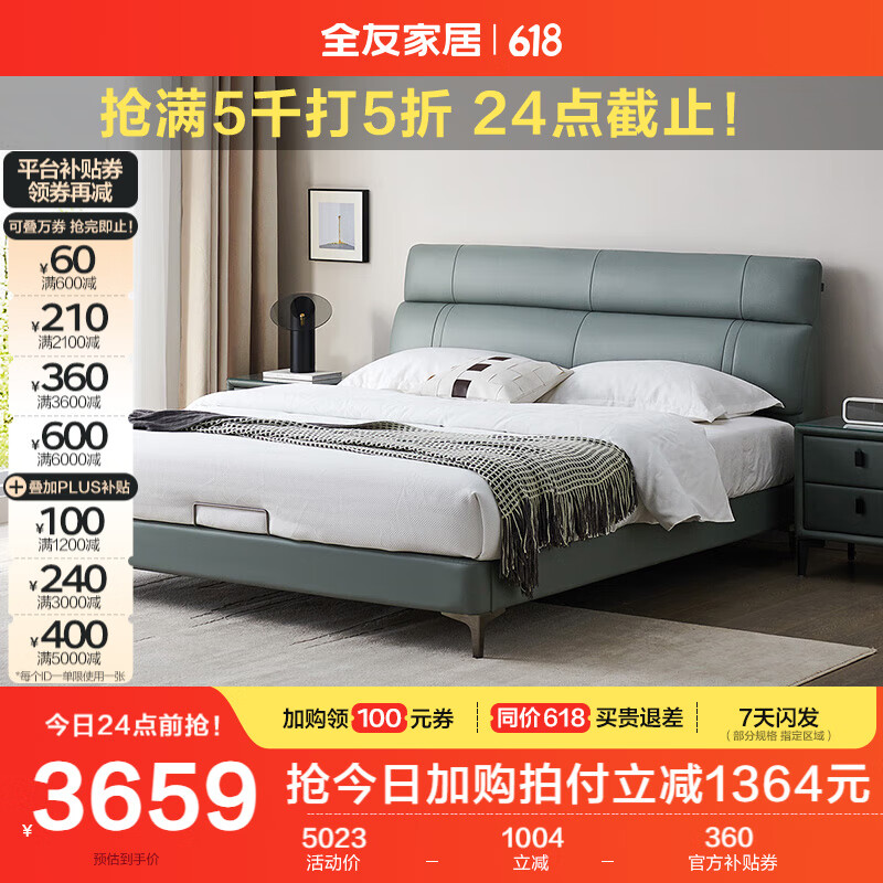 全友家居 真皮床 头层牛皮现代简约主卧室双人皮艺软包大床轻奢105251价格:5023.75元!