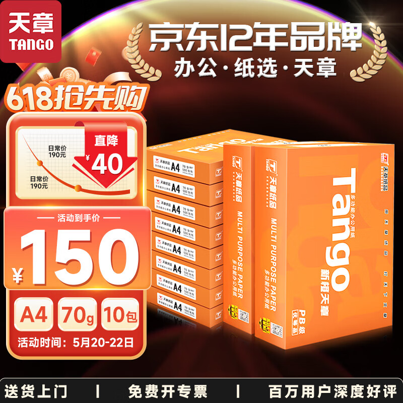 天章 (TANGO)新橙天章A4打印纸 70g 500张*10包 双面打印复印纸 顺滑畅打高性价比 整箱5000张【明星品质款】价格:150.00元!