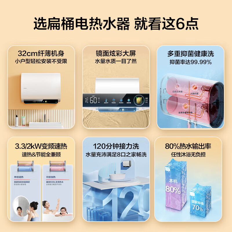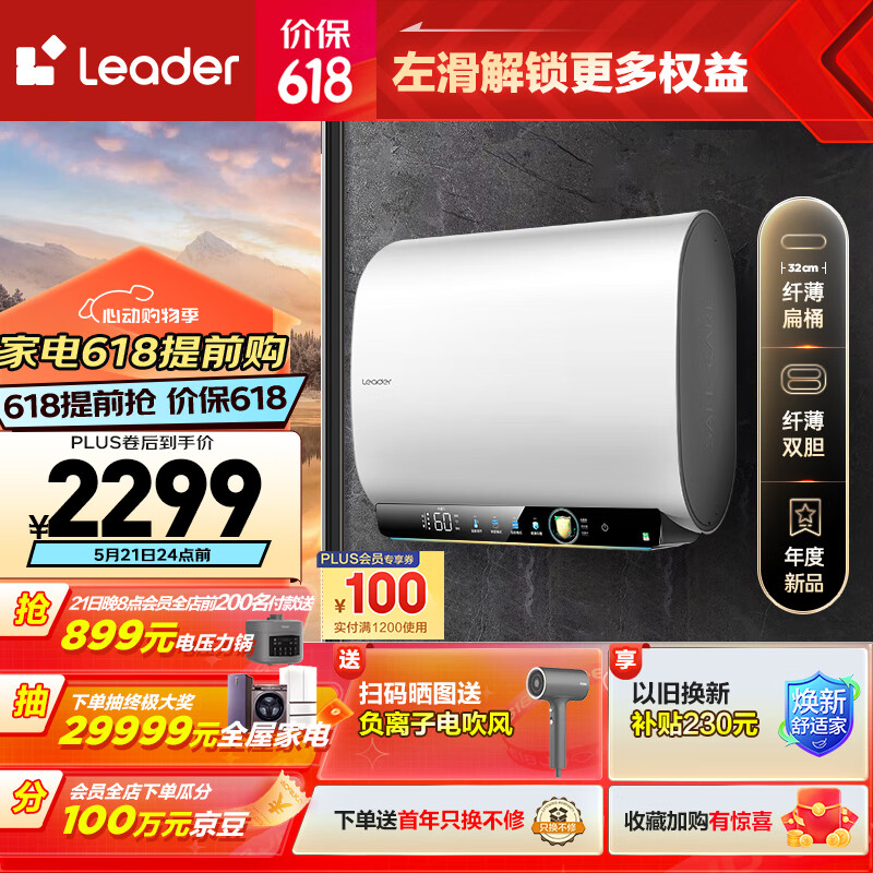 海尔智家出品 Leader电热水器80升小仙镜扁桶双胆3.3KW大功率速热免换镁棒一级能效 LEC8003HD-F5白U1价格:2599.00元!