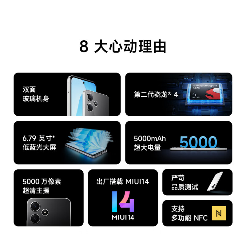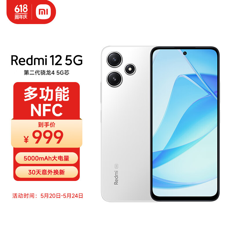 小米(MI)Redmi 12 5G 骁龙4第二代 双面玻璃机身 5000mAh大电量 8GB+256GB 冰瓷白 智能手机 小米红米价格:999.00元!