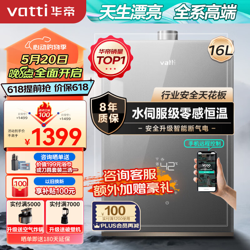 华帝(VATTI)16升燃气热水器天然气 水伺服级恒温 玻璃屏 ECO节能省气 智能wifi 气电双断 i12152-16价格:1499.00元!