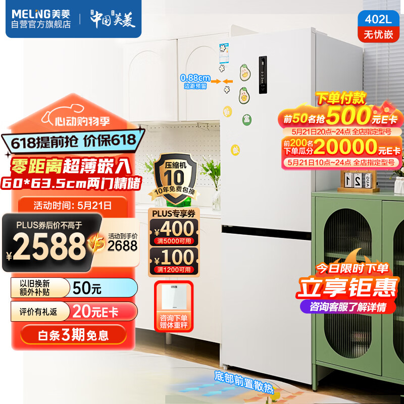 美菱(MeiLing)402升超薄零嵌入式两门双开门冰箱家用底部散热可拼接变频一级能效风冷无霜BCD-402WPCZX白价格:2688.00元!