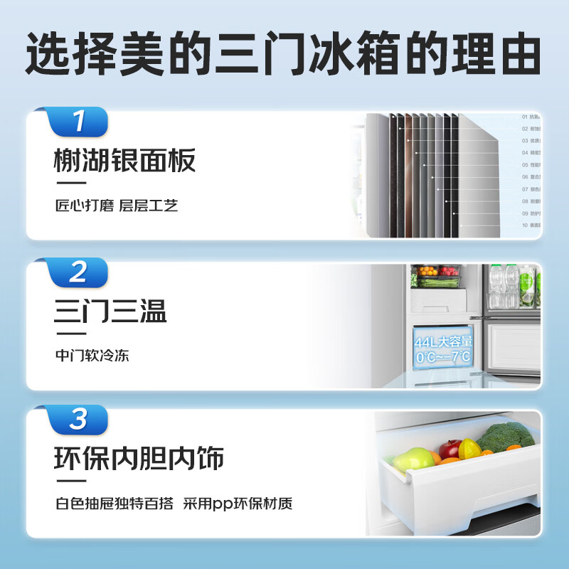 美的(Midea)215升三门三温超薄小户型租房家用宿舍节能保鲜省电低音软冷冻三开门小冰箱 BCD-215TM榭湖银价格:1299.00元!