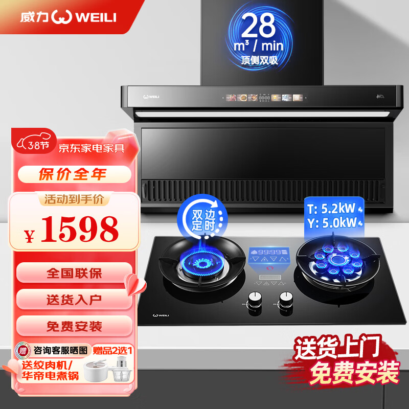 威力(WEILI)抽油烟机家用顶侧双吸油烟机灶具两件套28m3大吸力彩屏吸油机燃气灶套装WLQ07+WL206S(天然气)价格:1598.00元!