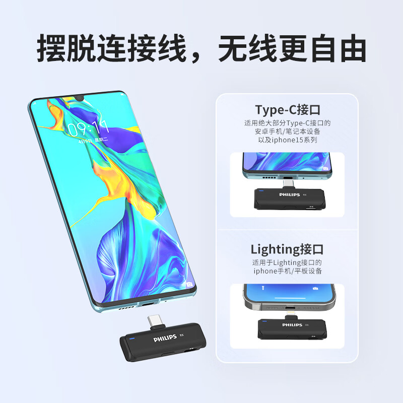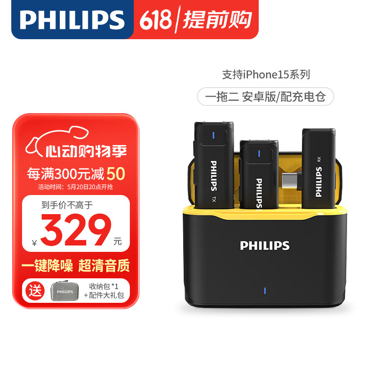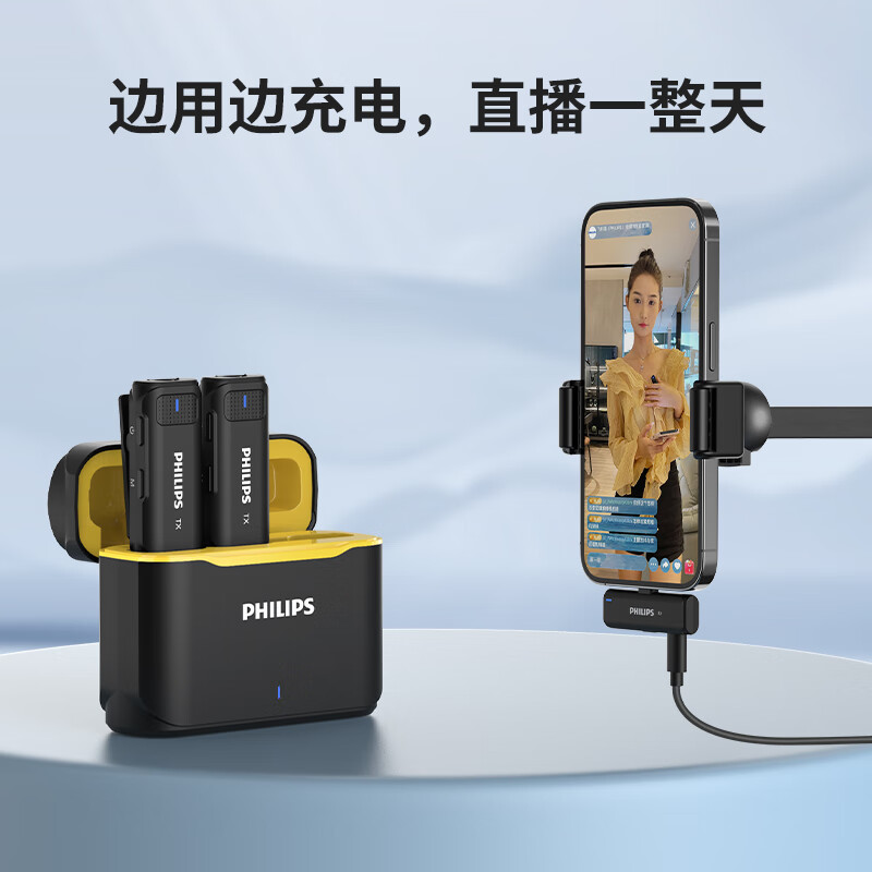 飞利浦(PHILIPS)无线领夹麦克风一拖二小蜜蜂收音麦声卡主播直播麦设备户外短视频直插式收音器DLM3545C(带充电仓)价格:379.00元!