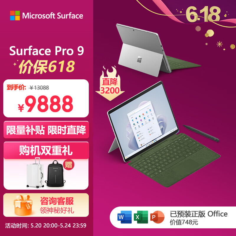 微软Surface Pro 9 亮铂金+森野绿带触控笔键盘盖 i5 16G+256G 二合一平板电脑 13英寸120Hz屏 办公本价格:9888.00元!