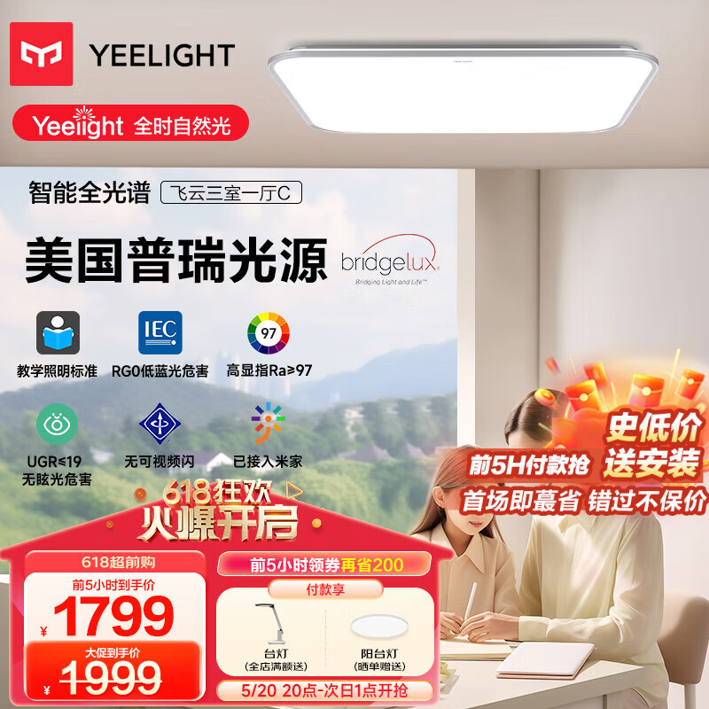 Yeelight普瑞芯片护眼led吸顶灯全光谱超薄客厅餐厅灯智能灯具套餐3室1厅C价格:2399.00元!