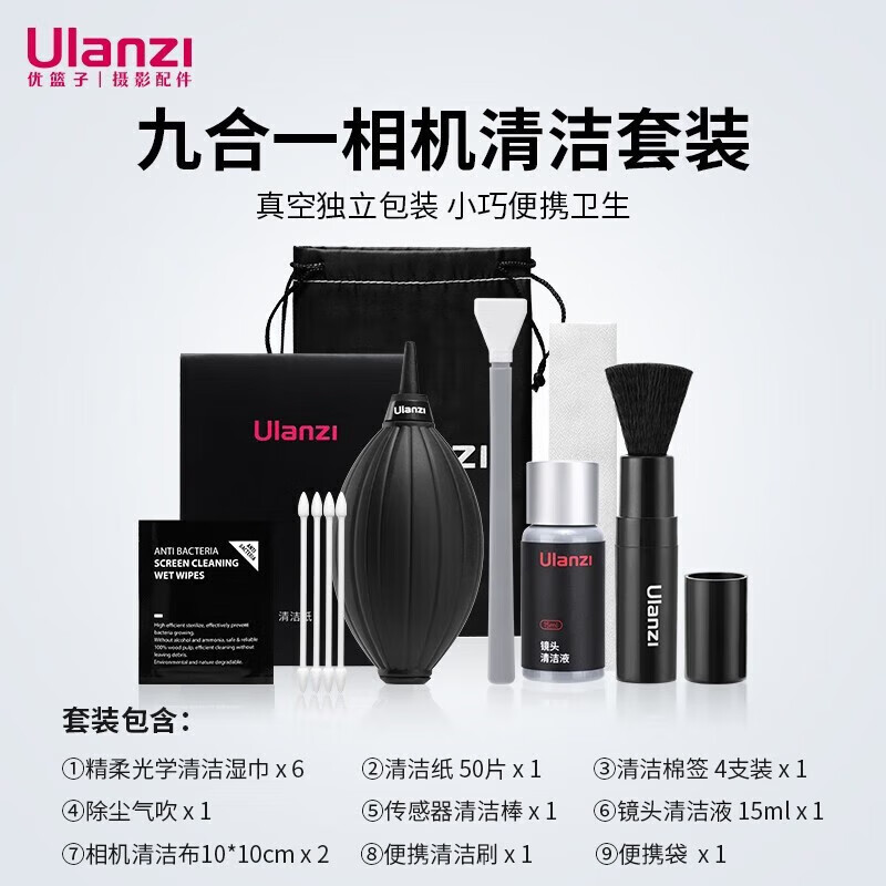 优篮子ulanzi 摄影师工具套装佳能尼康索尼通用清洁工具清洁棒镜头清洁布软毛气吹镜头清洁剂价格:199.00元!