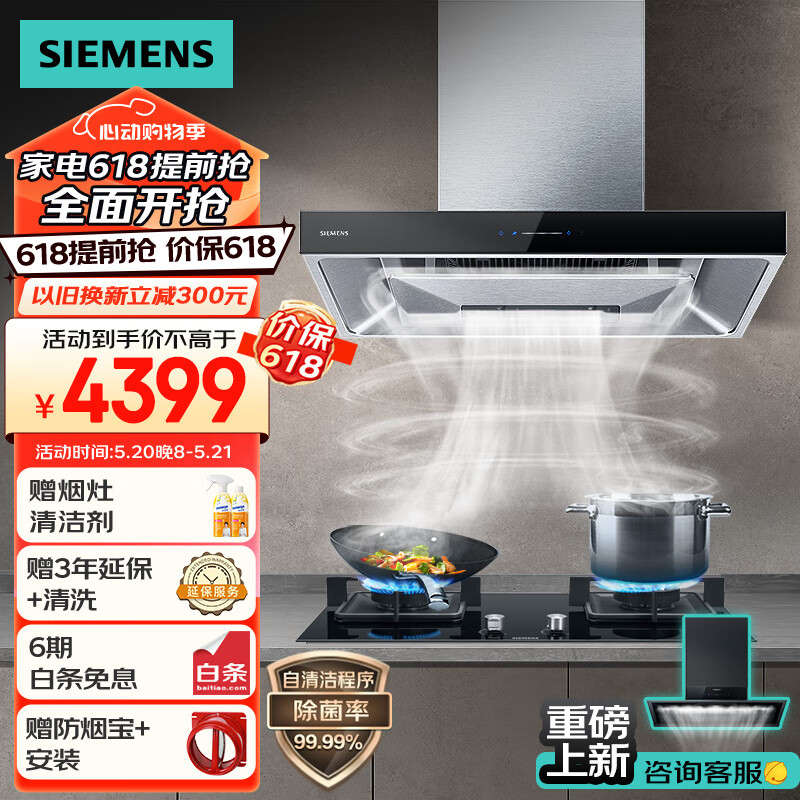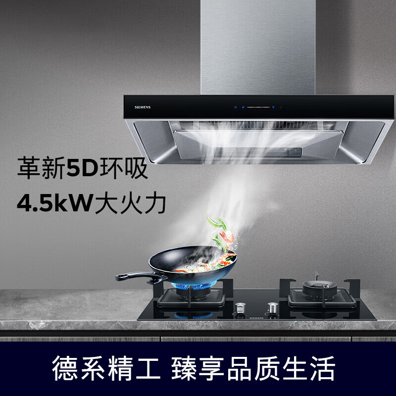 西门子(SIEMENS)抽油烟机灶具套装21.5m3/min 5D环吸油烟机 4.5kW燃气灶951W+GA23MP烟灶套装天然气以旧换新价格:4399.00元!