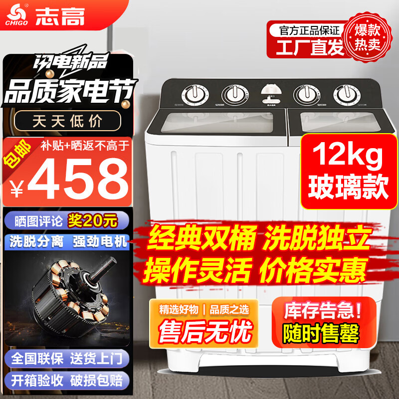 志高(CHIGO)半自动双缸洗衣机12公斤大容量租房宿舍家用双桶双缸波轮洗衣机脱水甩干双筒 玻璃盖板价格:518.00元!