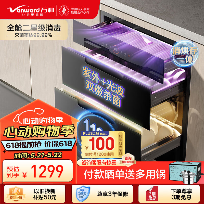 万和(Vanward)消毒柜家用 嵌入式 厨房餐具碗柜碗筷茶杯茶具婴儿奶瓶 紫外线二星消毒 110L三层大容量ZTD110Q-D8价格:1399.00元!