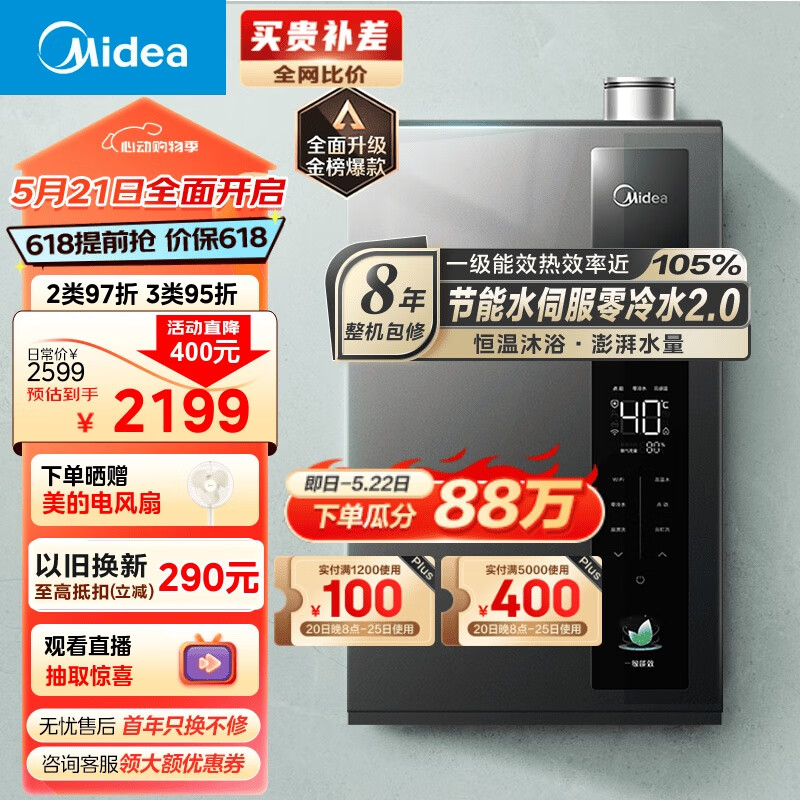 美的(Midea)18升燃气热水器 天然气 水伺服恒温 增压零冷水 超一级能效节能 多重安防 大水量 JSLQ30-18LN3价格:2499.00元!