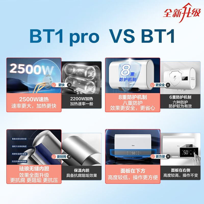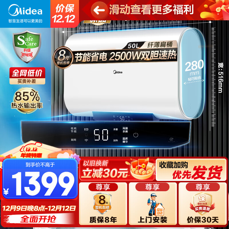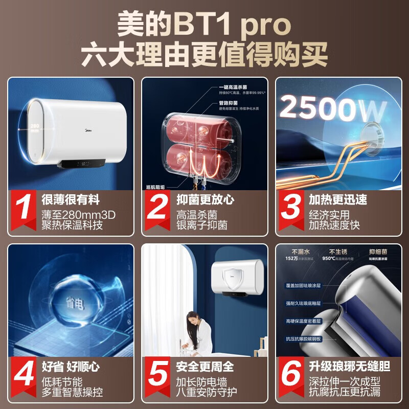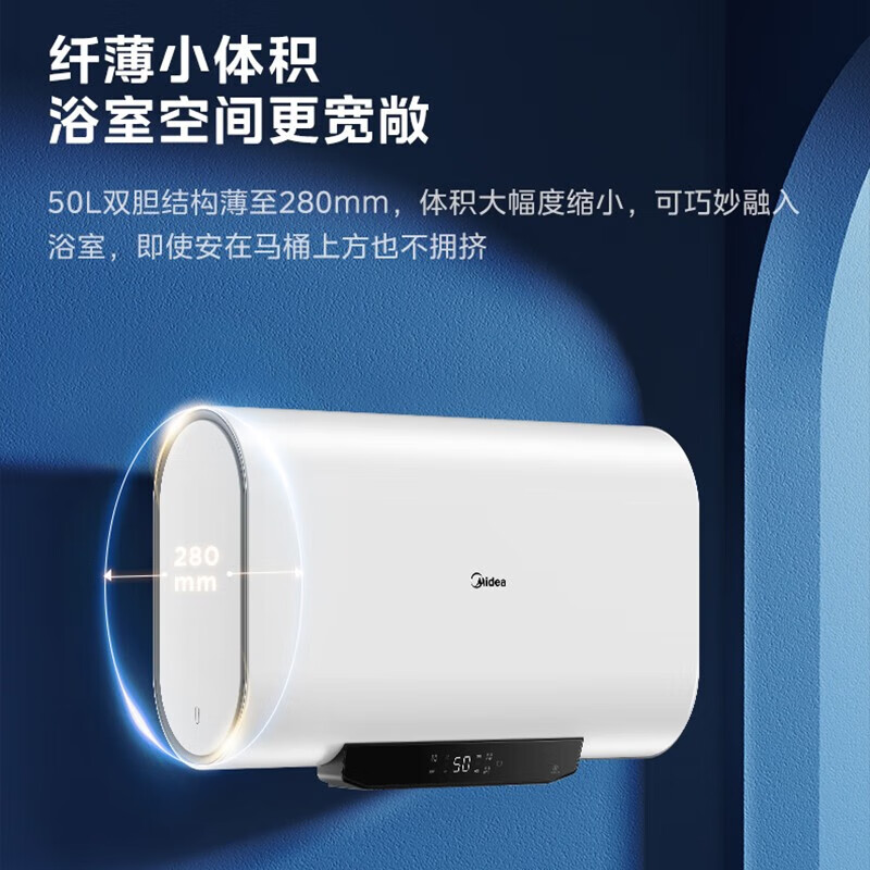 美的(Midea)家用储水式电热水器扁桶玲珑超薄机身2500W速热 省空间 50升节能双胆速热智能家电F5025-BT1pro(H)价格:1399.00元!