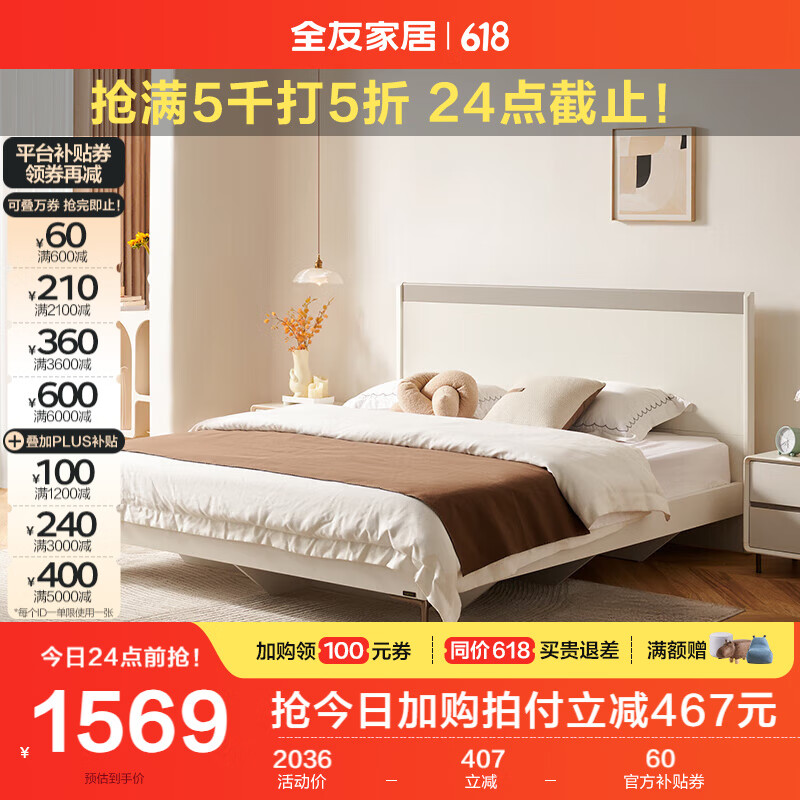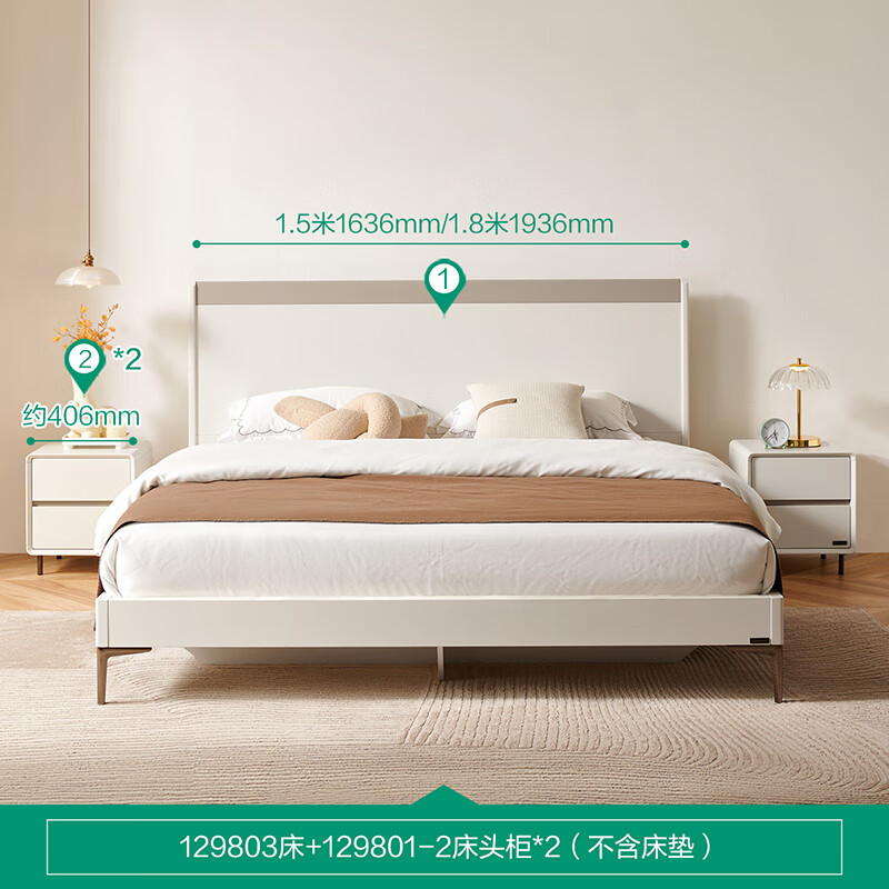 全友家居 奶油风板式床1.8x2米现代简约主卧室双人轻奢大床婚床129803价格:2036.25元!