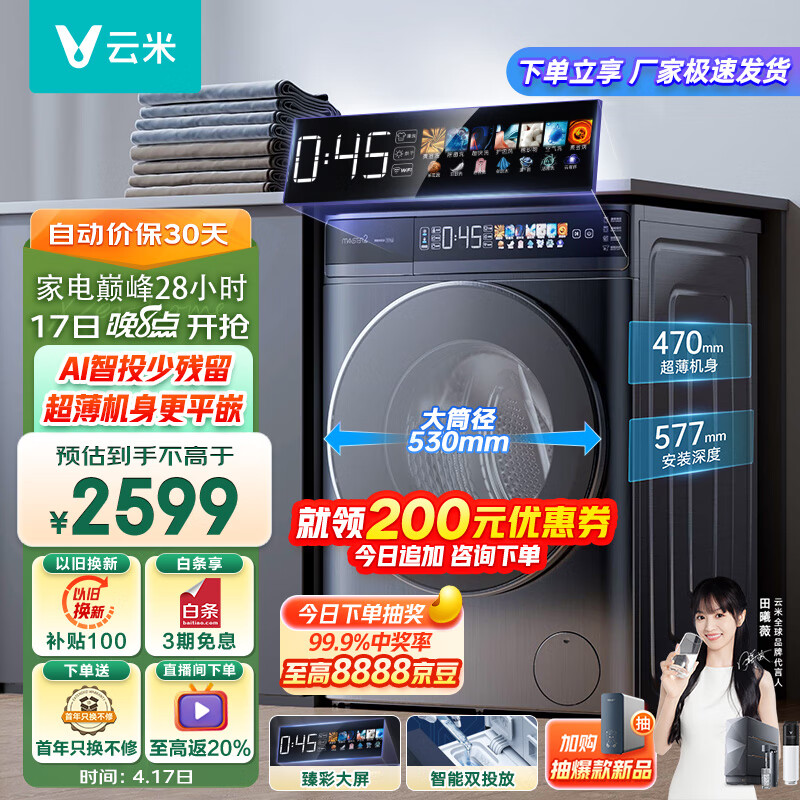 云米(VIOMI)滚筒洗衣机全自动 超薄全嵌 10公斤洗烘一体 彩屏 智能投放 除菌 Master2大筒径 WD10FT-G6A价格:2799.00元!