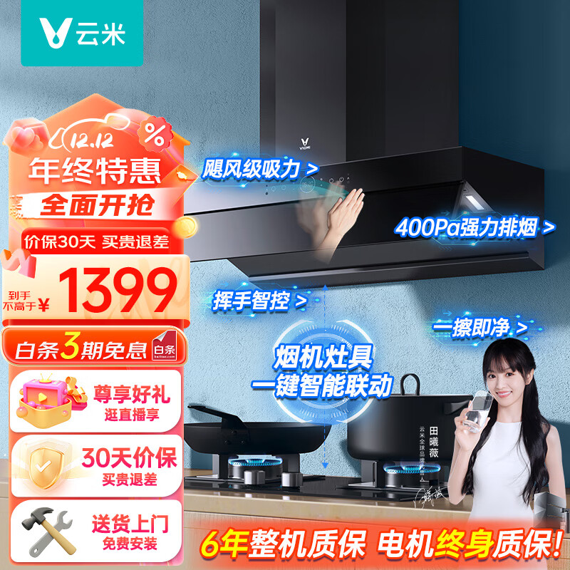 云米(VIOMI)Flash油烟机家用烟灶23立方大吸力侧吸自清洗挥手智控以旧换新4.2kw燃气灶VK703A+VG203天然气套装价格:1639.00元!