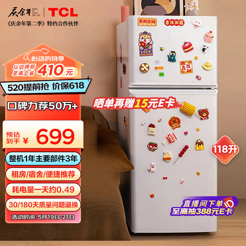 TCL 118升双开门两门二门养鲜冰箱小户型小型家用电冰箱迷你租房办公室LED照明节能冰箱BCD-118KA9价格:692.00元!