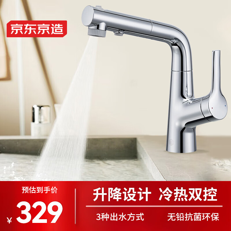 京东京造浴室面盆升降抽拉水龙头 3功能冷热双控卫生间台盆漱口 典雅银价格:329.00元!